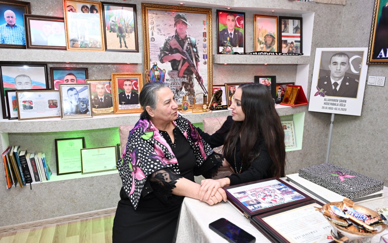 Daha sonra şəhidin anası Nərgiz Allahyarova ilə söhbət edib, onun oğlu haqqında xatirələrini dinləyib, şəhidin həyatının müxtəlif dövrlərini əks etdirən şəkillərinə baxıb, Vətən müharibəsi dövründə ailə üzvlərinə göndərdiyi videoçarxı izləyib.