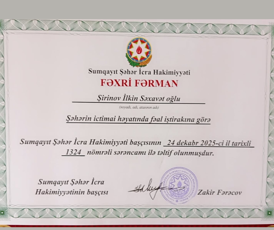 Qərbi Azərbaycan İcmasının Sumqayıt nümayəndəliyinin sədr müavini İlkin Şirinov da ictimai fəaliyyəti, Qərbi Azərbaycan həqiqətlərinin təbliği və gənclərlə iş sahəsindəki xidmətlərinə görə fəxri fərmanla mükafatlandırılıb. Bu təltif İlkin Şirinovun uzunmüddətli ictimai fəaliyyəti və icma daxilində göstərdiyi fəallığa verilən yüksək qiymətin göstəricisidir.