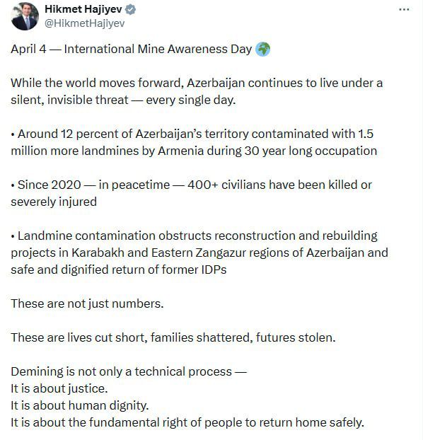 Gündəm24.az xəbər verir ki, bu fikirləri Azərbaycan Prezidentinin köməkçisi – Prezident Administrasiyasının (PA) xarici siyasət məsələləri şöbəsinin müdiri Hikmət Hacıyev Beynəlxalq Mina Maarifləndirmə Günü ilə bağlı “X” sosial media hesabında paylaşımında qeyd edib.