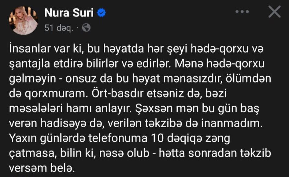 “Ört-basdır etsəniz də, bəzi məsələləri hamı anlayır. Şəxsən mən bu gün baş verən hadisəyə də, verilən təkzibə də inanmadım. Yaxın günlərdə telefonuma 10 dəqiqə zəng çatmasa, bilin ki, nəsə olub – hətta sonradan təkzib versəm belə” – müğənni əlavə edib.